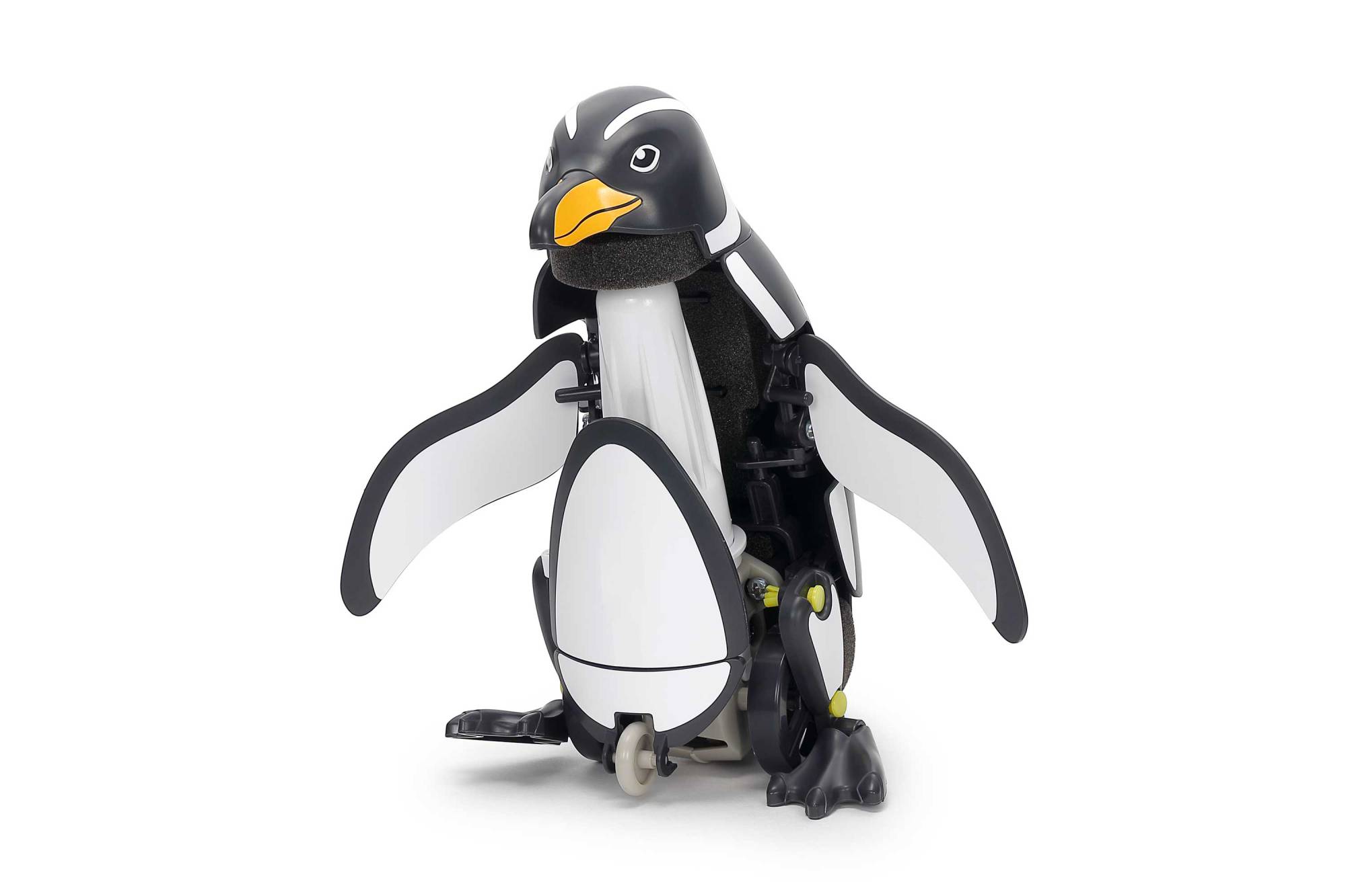 Ce kit permet de construire un pingouin mécanique amphibie se dandinant sur terre et nageant dans l’eau. Il se déplace grâce à un mini moteur qui actionne pattes et nageoires. Dans l’eau, le modèle lève la tête et avance en battant ses nageoires. Un gouvernail réglable permet de modifier la direction de déplacement dans l’eau. Le kit comprend toutes les pièces nécessaires pour un assemblage simple par emboîtement et vissage.